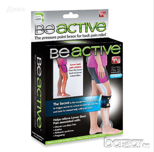 Наколенка Be Active Специално конструирана наколенка - ортеза с акупресурна подложка, която облекчава болките в кръста, гърба и краката. Действието на наколенката се дължи на специалната подложка, оказваща натиск върху точно определени акупресурни точки, в резултат на което премахва напрежението от крака и помага за облекчаването на нервни и хронични болки в гърба и кръста. Може да се използва от мъже или жени, като работи на левия или десния крак, може да се носи над или под дрехите. При поставяне на съответният крак - ляв или десен, трябва да се съблюдава посоката, за да попадне специалната подложка в правилната акупресурна зона отстрани на коляното.Характеристики:Един размер - регулируемУнисексПодходяща както за левия, така и за десния кракДискретна под дрехите