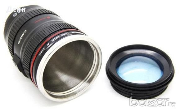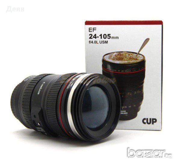 Това е термочаша с обектив, който е точно копие на Canon EF 24-105 mm. F/4.0L. За да допълни още повече това - капакът й е прозрачен. Налице са й всички останали детйли на този вид фотоарарат. Тя има двойноизолиращо покритие и може да побере до 400 мл. Цветът й е черен. Такава чаша ще бъде идеалният подарък за всички любители на фотографията, а защо не и за Вас, ако и Вие сте един от тях!