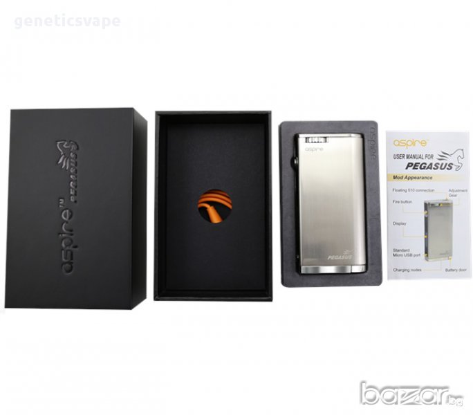 Pegasus е част от серия вейпинг устройства на Aspire. В нормален режим, Pegasus доставя до 70 W мощност. Използва сменяема 18650 батерия (не е включена). В режим на контрол на температурата, Pegasus осигурява 50 W мощност. Pegasus е конструиран да работи от 0.2Ω до 5Ω в нормален режим и при 0.1Ω в режим TC (температурен контрол). Съвместим е с почти всички sub ohm резервоари, които се предлагат на пазара. Увеличаването / Намаляването на мощността се извършва чрез хоризонталния диск над бутона за включване/изключване, което допринася за лесното му регулиране дори с една ръка. Кристално ясен LED екран показва информация, която включва изходна мощност и напрежение, устойчивост на пулверизатора и мощност на батерията. Отделението за батерията отварящо се с капаче ви позволяват бързо да смените батерията без никакви проблеми.