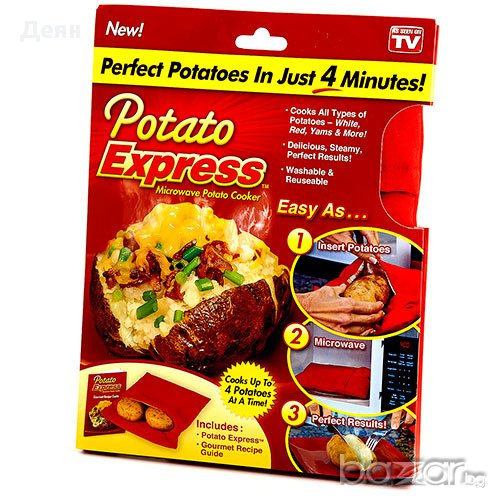 В забързаното ни ежедневие често нямаме време и сили да сготвим вкусна храна за своето семейство! Сега има решение за тези напрегнати дни! С прекрасните торбички Potato Express - ще се радвате на уникално препечени картофки с коричка само за 4 минути! Тук Ви представяме Potato Express - готвачът на картофи в микровълнова фурна! Това е специална чантичка, изработена от полиестер и памук, в която се слагат картофите. Тя е много лесна за използване. След като сте измили и подсушили картофите, трябва да ги сложите вътре в нея, да я затворите и да оставите за 4 минути във фурната. След като я извадите ще видите перфектните резултати и единственото, което Ви остава е да пробвате и да насладите на невероятния вкус. С нея може да приготвяте картофена салата, картофето пюре, както и всякакви други си ястия с картофи. Тя също е идеална за приготвяне на царевица на кочан, както и за превръщането на стария и твърд хляб, отново в мек.Характеристики: