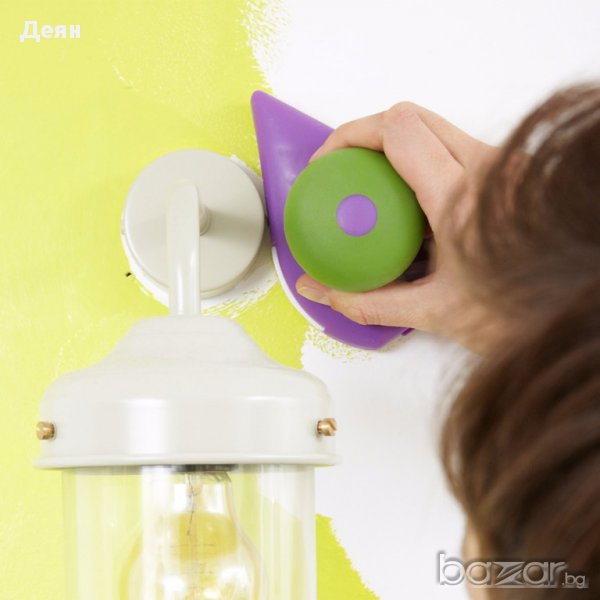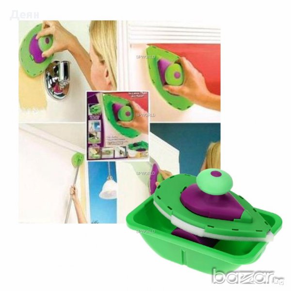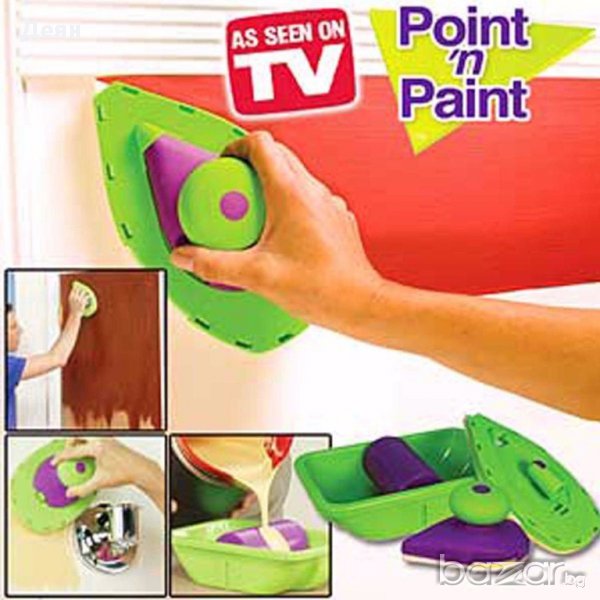POINT AND PAINT e най-новият високотехнологичен и хитър помощник на домашния бояджия. Комплектът е съставен от 2 "валяка" - дунапренени четки с форма на ютия, които много удобно боядисват постранството до ъгъл без помощта на тиксо и помощни материали. ПРОСТО ОТСИЧАТ без да внимавате, без опастност от теч, подливане или изцапване на тавана. Двете "четки" поемат нужното количество боя от специално констроираната роторна ваничка, която разпределя перфектно съдържанието и количеството боя по четката. Голямата "четка" има чупещо във всички посоки рамо за завиване на удължител (не включен в комплекта).