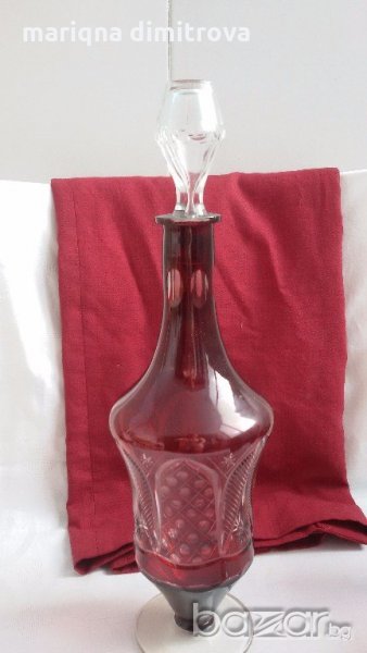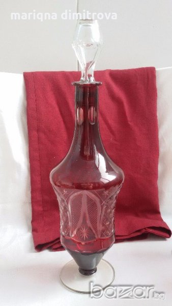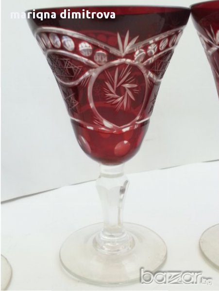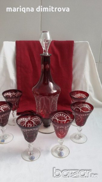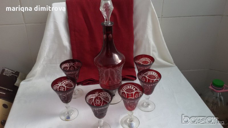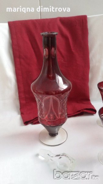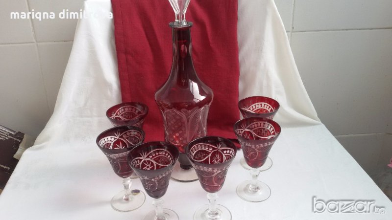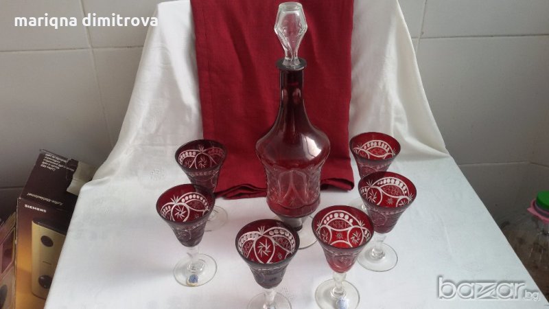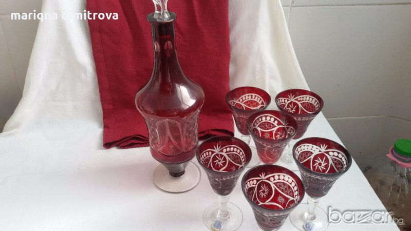 гравирани чаши цветен червен кристал 17см 6 бр и бутилка гарафа шише висока 40см ръчно гравирани кристално стъкло цветно червено стъкло сервиз комплект сет лот чаши на столче шише стъклена тапа ретро арт декор винтидж колекция стари старинни антикварни предмети обзавеждане за дома и семейството подходящи за подарък за ценители и колекционери