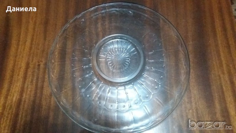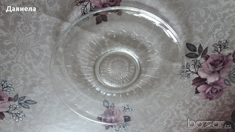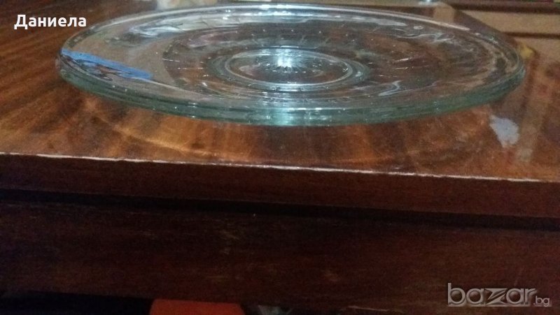 Голяма плитка чиния от дебело закалено стъкло с диаметър-29см.Чинията почти не е използвана,много е красива и е със столче.Подходяща е за сервиране на торта,кекс,сладки,сладкиши и др.