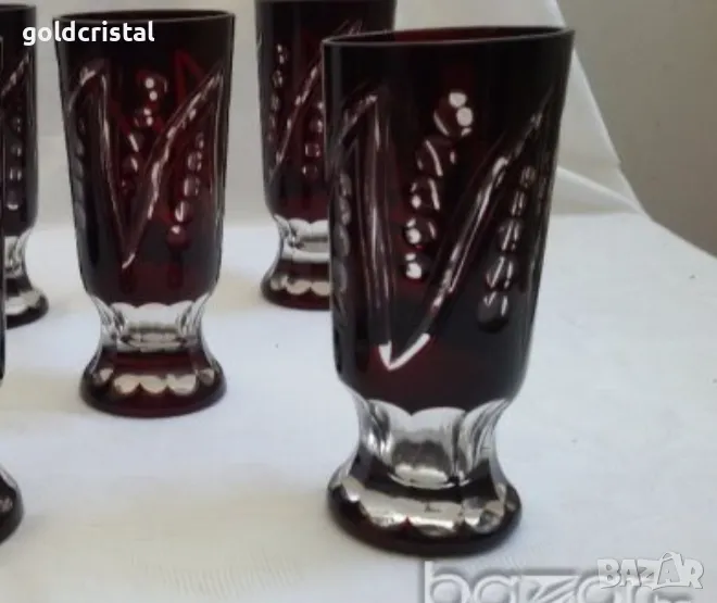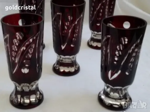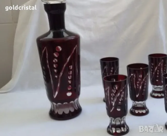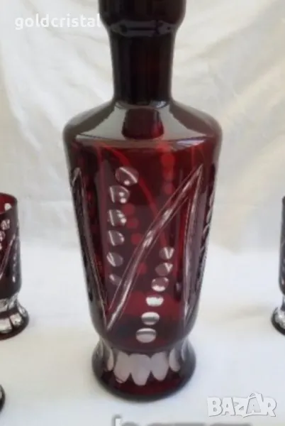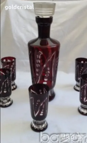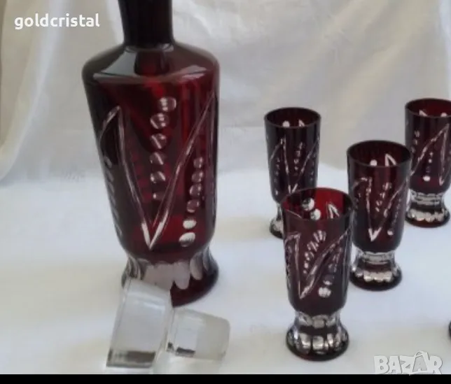 сервиз кристална гарафа и 4 броя чаши червен кристал ръчно гравирани цветно кристално стъкло кристал кристални чаши сервиз комплект сет лот стари ретро арт декор винтидж колекция стари антикварни предмети обзавеждане за дома и семейството подходящи за подарък за ценители и колекционери