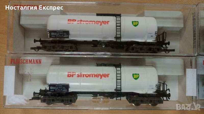 Композиция от 6 четири-осни вагона цистерни за петролни продукти Бритиш Петролеум, производство на Флайшман, мащаб 1:87, в добро състояние с оригиналните кутии. Дължина на композицията 120 см. Композицията е много подходяща
