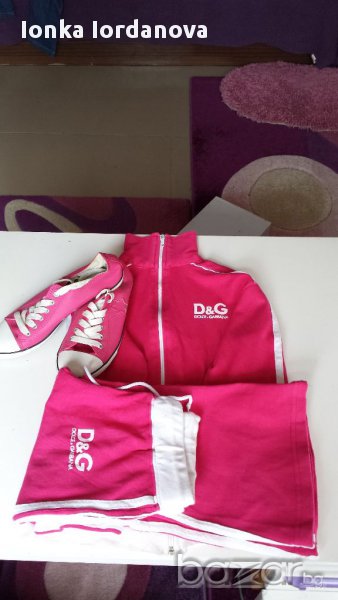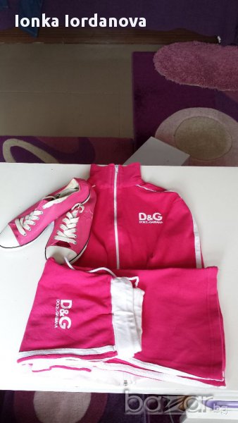 Спортен екип-памучен и розови пътъчки от еко кожа. Дължина на стъпало -23см. Дължина на долнището-92см. Дължина на горнището-48см. Гръдна обиколка: 86 см. В прекрасен вид.