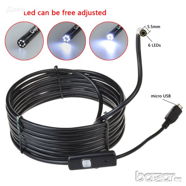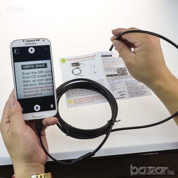 Ендоскоп за ANDROID-отличен начин да разберете дали изгубените предмети са зад тежката секция или друго тясно пространство.Ендоскопа е съвместим с всички устройства работещи с ANDROID.Можете да правите видео клип или да снимате и да записвате на вашият телефон или PC.Предимства:-лесен начин да гледате в реално време-гъвкава тръба позволява проникване дори в извити пространства-камерата дава отлична картина-може да се използва на лаптоп с преходник в комплектаСпецификация:резолюция:HD:640*480,1200*720 за PCPixels:300000 за телефон,1300000 за PCВъншен диаметър - 7 ммОсветление - 6 ярки диода (LED)ВодоустойчивКомплекта включва:1бр. OTG ендоскоп за андроид 1бр. преходник micro (otg) към стандартно USB1бр. кука1бр. магнит1бр. огледало1бр диск с драйвери ЗАБЕЛЕЖКА:-ендоскопа работи само с Android 4.0 или по нова версия-телефонът ви трябва да поддържа OTG функция.-ендоскопа не поддържа ISO системи-разбира се,работата на ендоскопа с телефона е само една от функциите му,ако не можете да го използвате на телефона ,може да го използвате на PC.
