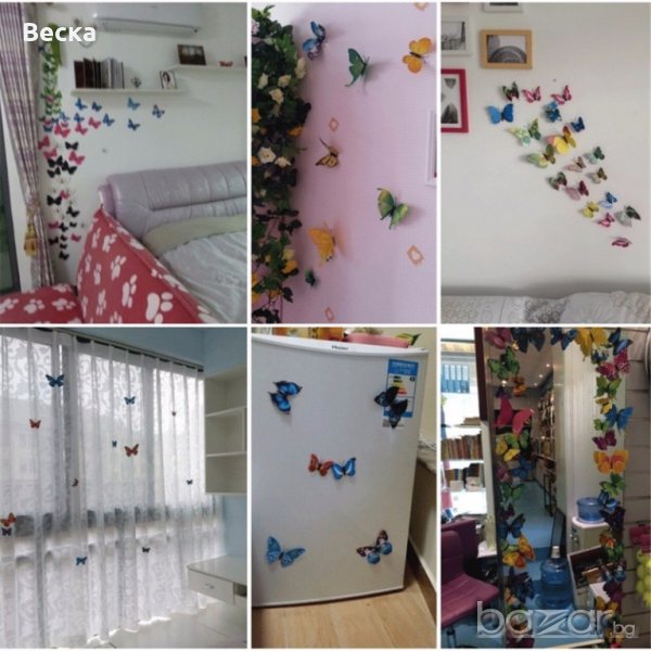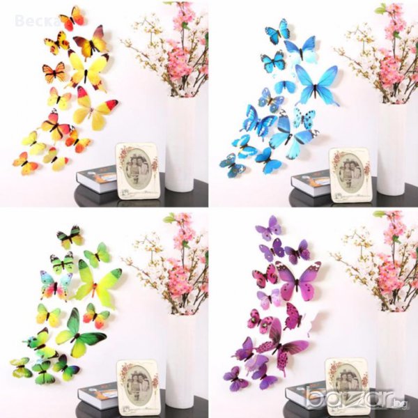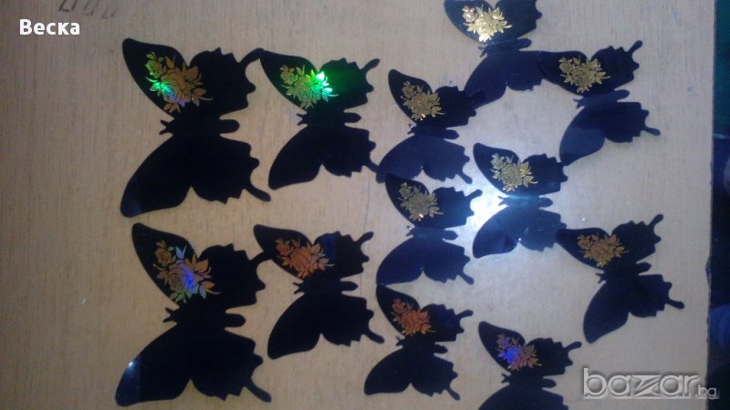 Продавам 3д стикери пеперуди за декорация на домове ,офиси магазини и заведения .Материал ПВЦ.Комплекта съдържа 12 бр.различни по размер пеперуди и самозалепващи ленти .