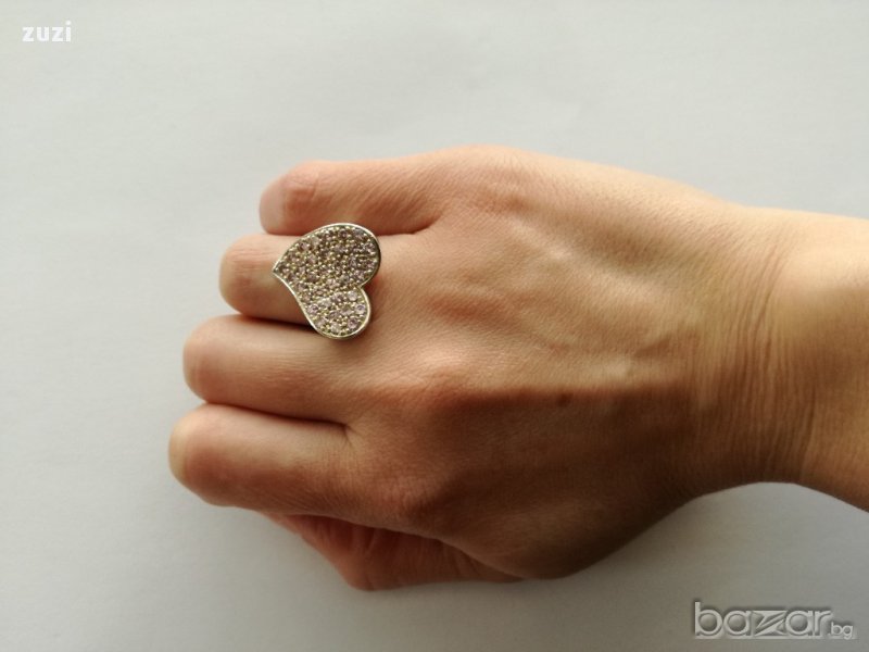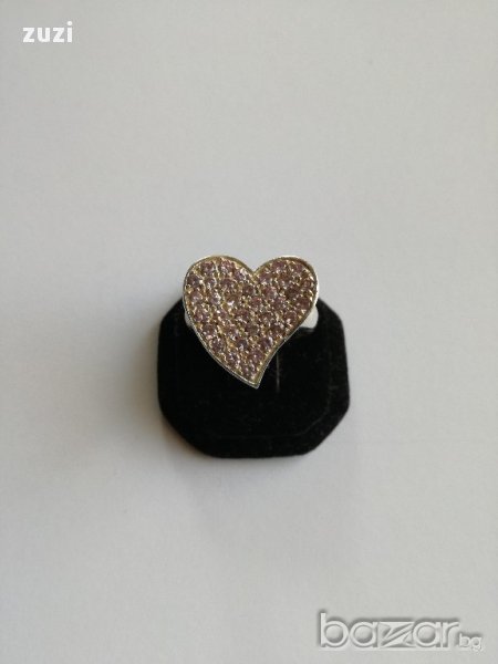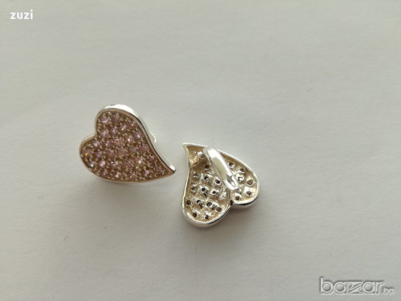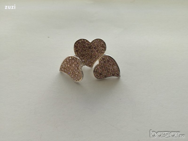 Сребърен комплект , сърца с розови цирконий - пръстен и обеци - сребро проба 925 → Обява 17497919