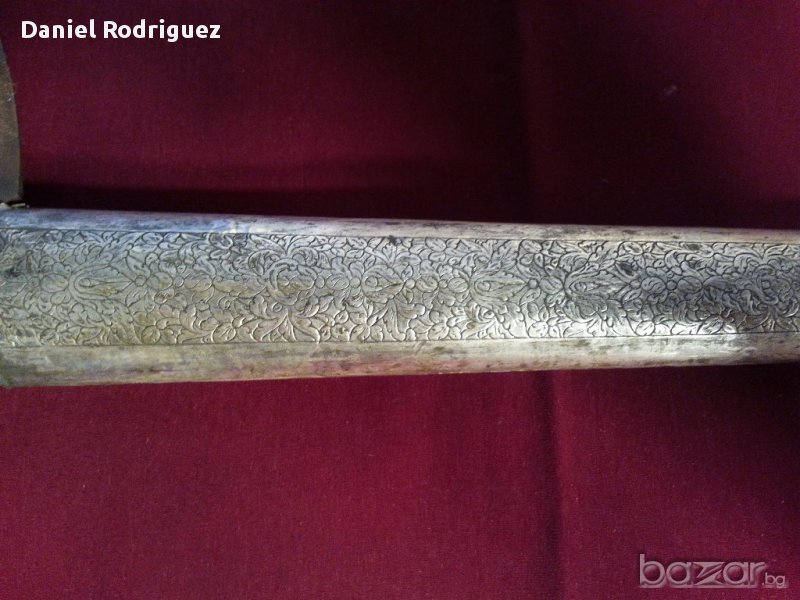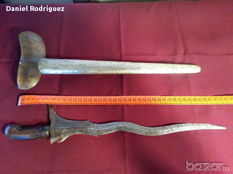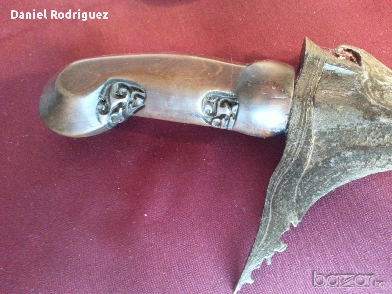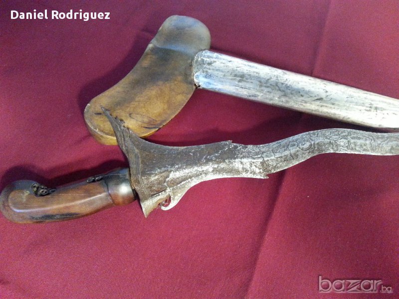 Уникална Автентична Кама КРИС , Керис Със Змиевидно Острие., Ръчно Изкована През 19 Век от Многопластова Дамаскова Стомана Добита от Метеорит, Чиято Технология е Неизвестна и до Днес .На 90% стоманата от която е изкован е извънземна,някои я наричат още див дамаск .Нещо Абсолютно рядко срещано днес.Много Красива Сребърна кания с флорални елементи , дръжката е от Махагоново дърво с прекрасни дърворезбички.Крис е традиционен меч на Индонезия .Размер :Дължина на Криса 410мм , дължина с Канията 460мм. Състоянието е видно.Цената е БЕЗ коментар!!
