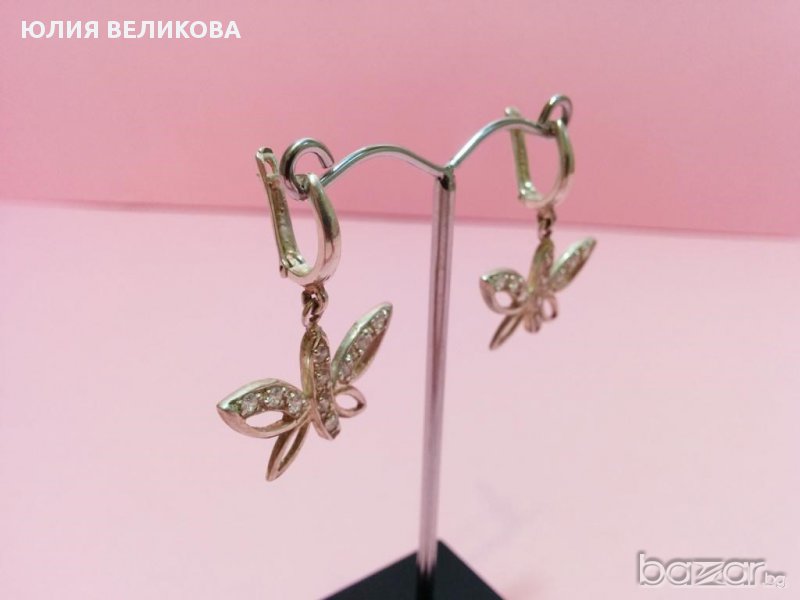 Сребърни обеци пеперуди с циркони. Английско закопчаване. Проба на среброто 925. Като нови!