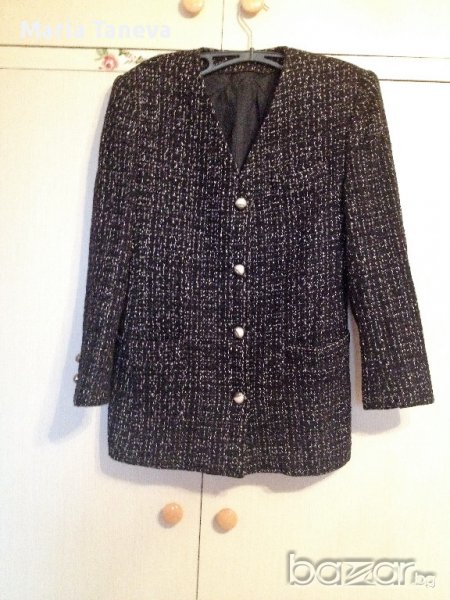 Дамско сако от ефектен черен плат напръскан с бели нишки. Предницата е с остро деколте, може да се носи с поло блуза или ризи в бяло, черно, червено или цвят по избор. Предницата е с два джоба и малко джобче горе, в което може да но сложи кърпичка при по-официални случаи. Дължината на сакото е 73 см, на ръкавите - 56 см.Разстоянието между раменете е 43 см. Сакото е в много добро състояние, малко е обличано.