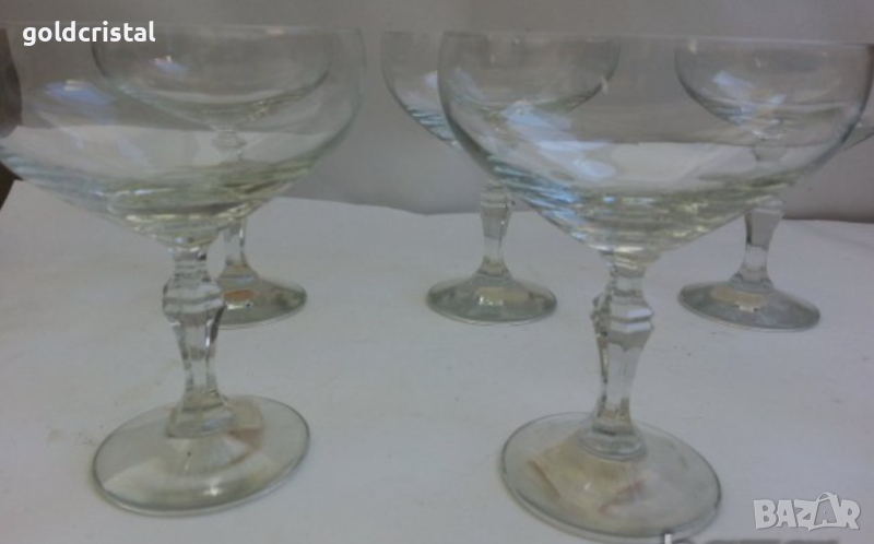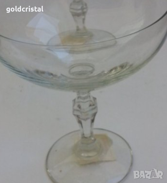 ретро стъклени чаши 6бр -45лв в кутия с етикета калиево кристално стъкло бълргарско старо производство на столче комплект сет лот ретро арт декор винтидж колекция за вино шампанско десерти мелби сладолед и др стари антикварни предмети обзавеждане за дома и семейството
