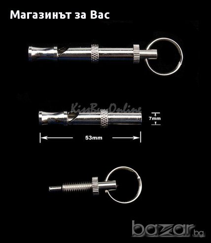 Свирка за обучаване на куче. Има възможност регулиране на звука, чрез въртене на предния й край избирате дали да бъде по-силен звука или по-слаб.