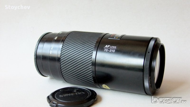 Minolta AF 70-210mm F4 (beercan). Sony А-байонет. Много добро състояние на обектива. Корпус с леки следи от употреба, оптика без забележки, функциониращ зум и автофокус. 55мм резба за филтър. Две капачки. 190 лева.