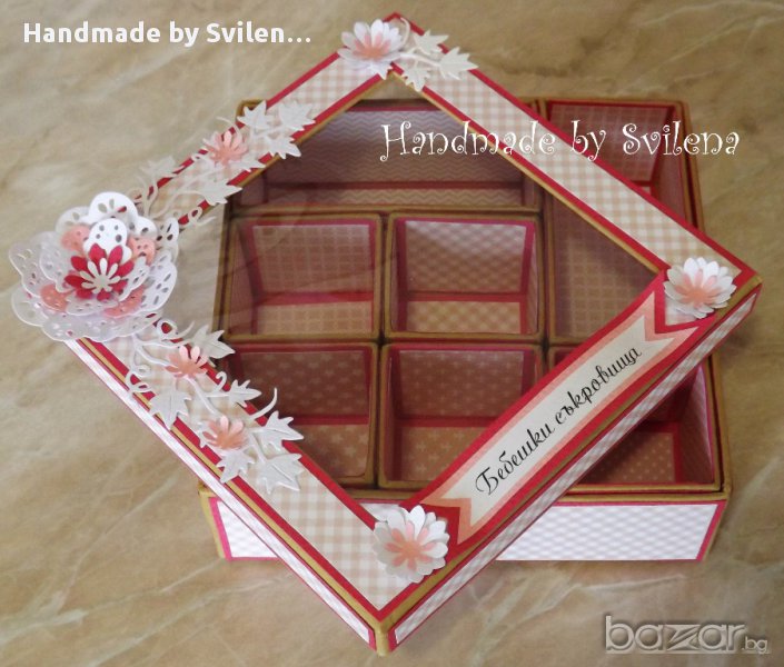 Кутията е сразмери 16/16 см., с прозрачен капак и има 5 малки квадратни кутийки и две правоъгълни.