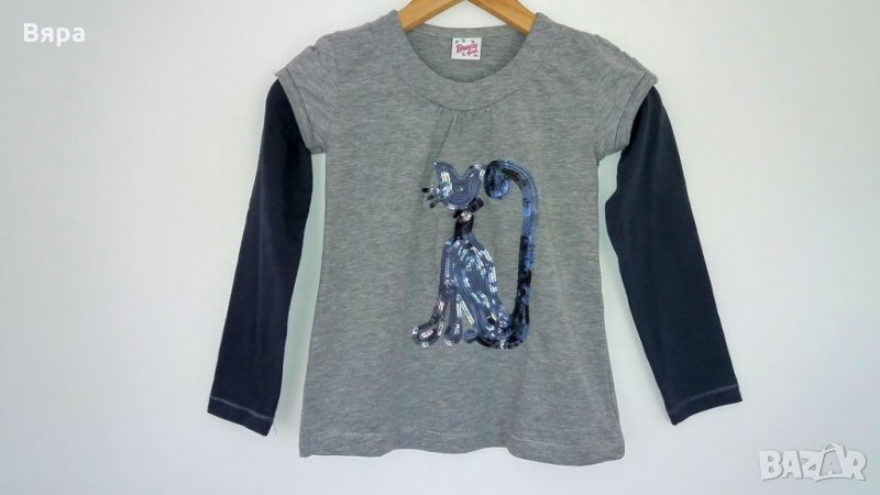 Блуза детска с котка от пайети. Има копче камъче в панделка на котка и на двата ръкава-горе. Много приятно памучно трико на две нива-два цвята.