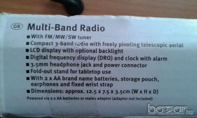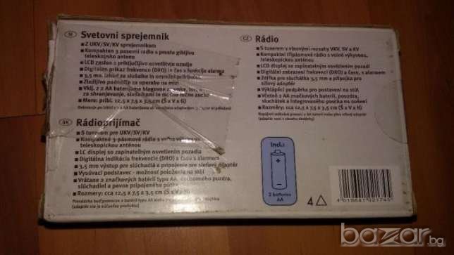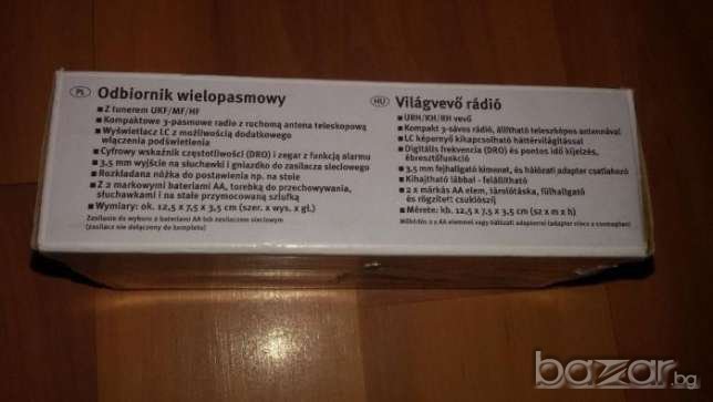 Размери 12,5/7,5/3,5см. LCD дисплей. Има слушалки в комплекта, калъфче. Освен радио има и часовник с аларма!