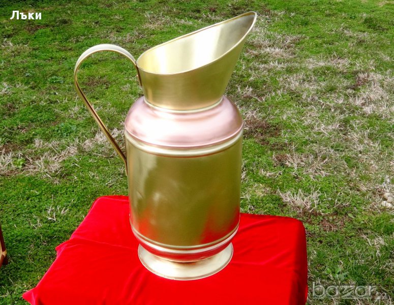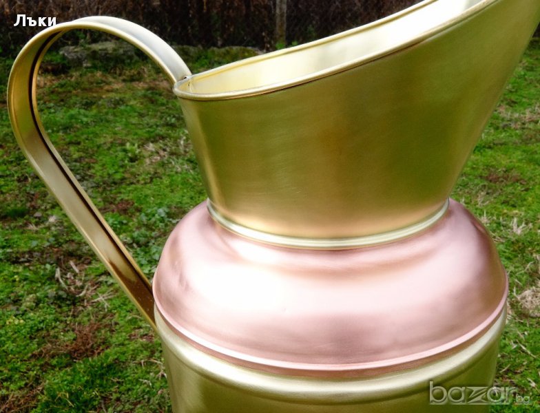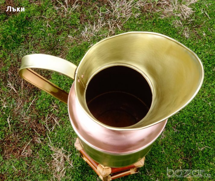 Старинна кана,ваза,поставка за чадъри или бастуни,майсторска ръчна изработка от кована чиста червена мед и високо качествен як бронз.От вътре не е калайдисана.Височина 54 см.,ширина с дръжката 38,диаметър 24.5 см.Тегло 1.8 кг.