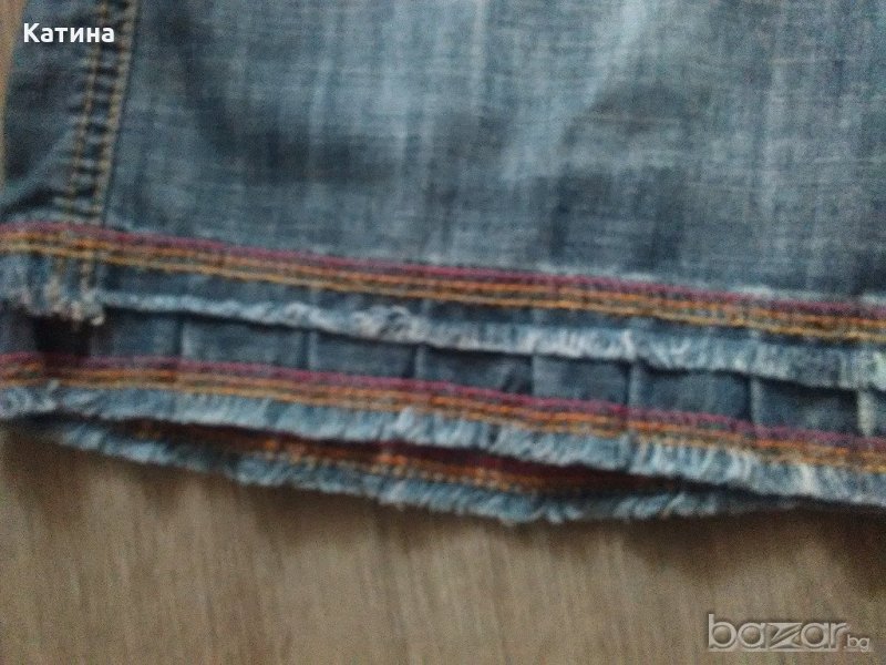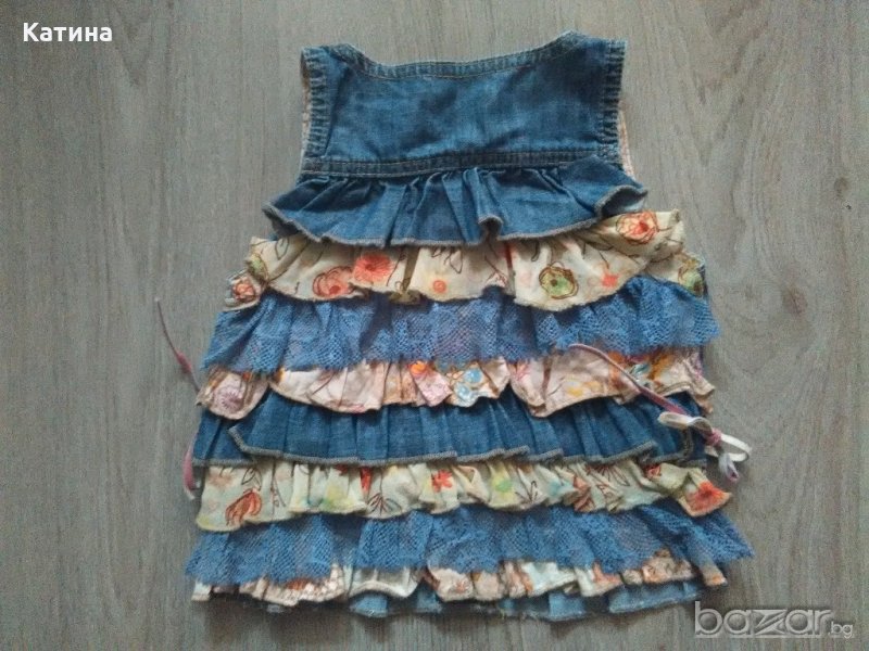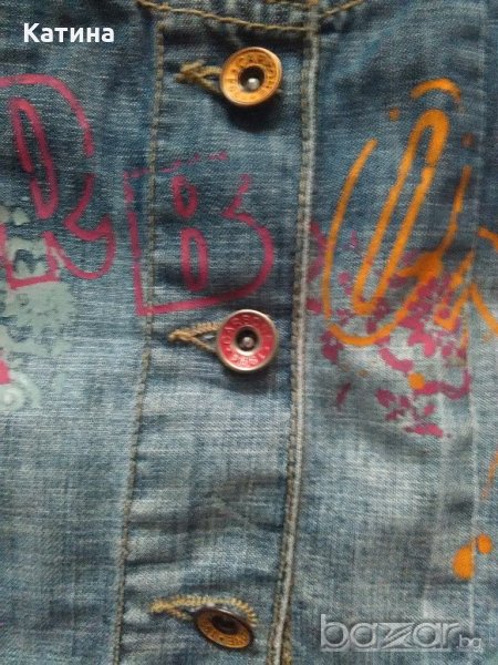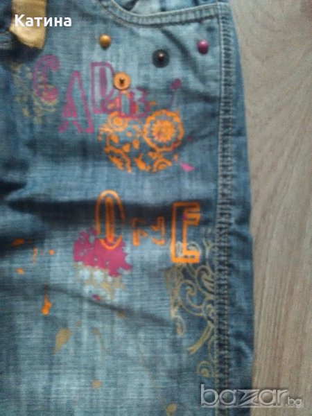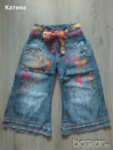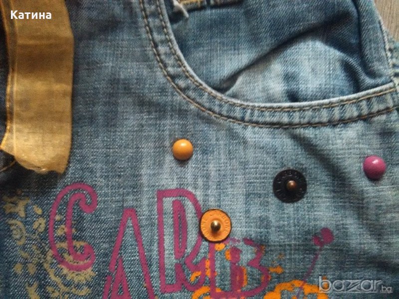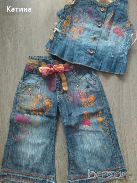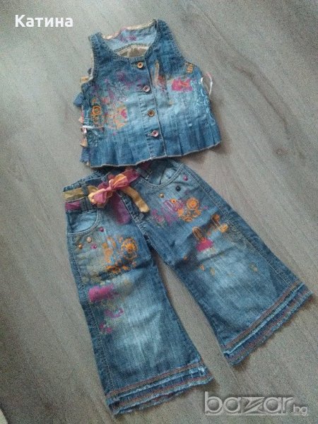 Супер модерен дънков комплект за малки принцески.Разкроени дънки,целите изпъстрени с цветни надписи(лого),капси и рисунки.Фабрично избелени и разнищени.Двуцветно феерично коланче в талията.Елече със същите мотиви и супер интересен гръб.Обличан 2-3 пъти. Размер 3-4 год.,104 см.Купуван от чужбина.