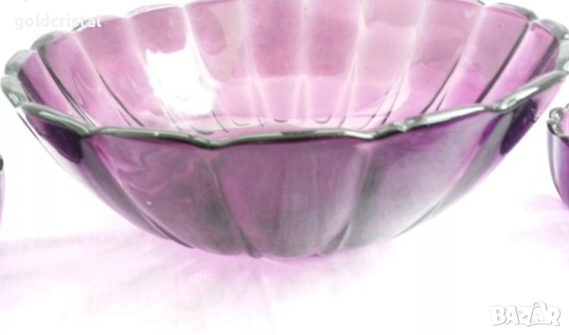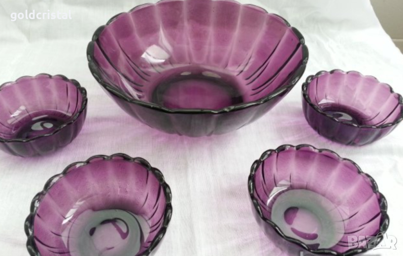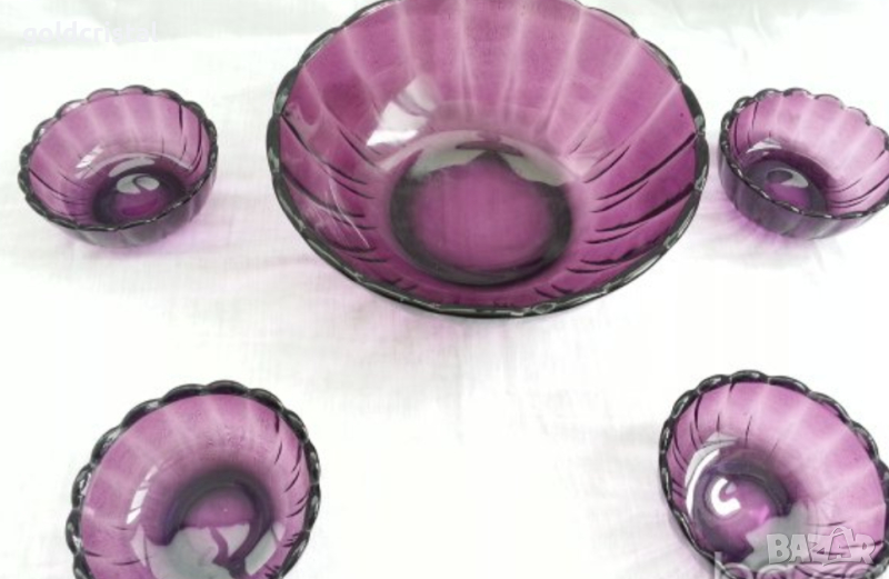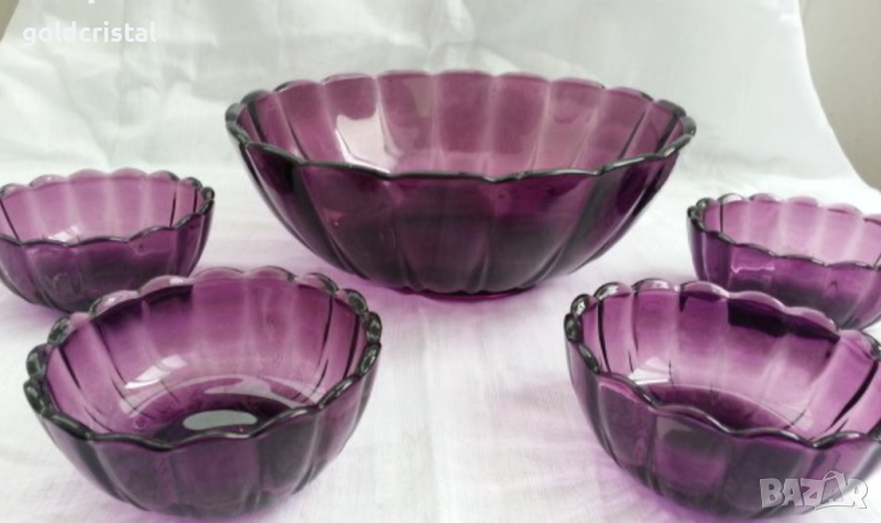 Антикварен сервиз лилаво цветно стъкло стъкло голяма купа и 4бр купички стар ретро арт декор винтидж колекция комплект сет лот кристално цветно стъкло стари антикварни предмети обзавеждане за дома и семейството подходящи за подарък за ценители и колекционери