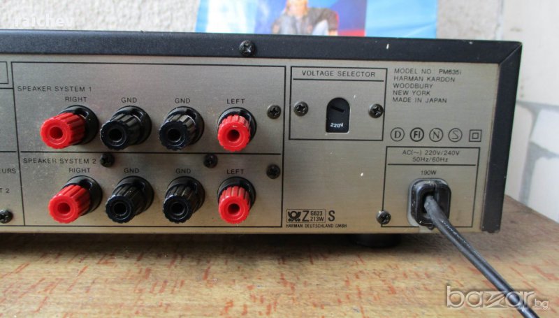 HARMAN KARDON PM-635i – Бюджетен транзисторен усилвател. Мощен 2 Х 30 вата на 8 ома. Работи с колони от 4 – 16 ома. Честотна