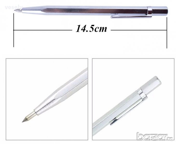 Маркова портативна чертилка, изработена от висококачествена CR-V стомана, оборудвана с клипс за джоб. Върхът е от легирана стомана – волфрамов карбид,която осигурява дълъг живот при чертане върху различни повърхности. За гравировка по стъкло, металокерамика, пластик, дървесина.Видима следа върху метал. Дължина 145 мм,тегло 55 g.