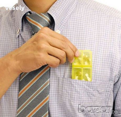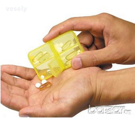 при предписано няколкодневно лечение. Контейнера съдържа 7 чекмеджета – надписани от понеделник до неделя. Всяко чекмедже има 4 отделения – сутрин, обяд, следобяд, вечер – там се поставят необходимите хапчета. Всяко чекмедже в контейнера има собствен цвят и обозначителен надпис.Контейнера, чекмеджетата и отделенията са от пластичен материал и имат правоъгълна форма с размери 105 х 75 х 45 mm – могат да се носят в джоба на сакото, ризата, чантичка.