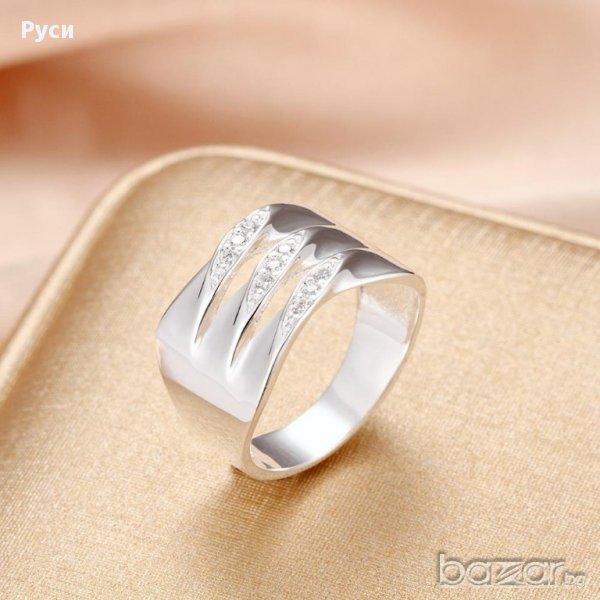 Пръстен със сребърно покритие-проба 925. Широк с малки бели кристали и три вълнички.