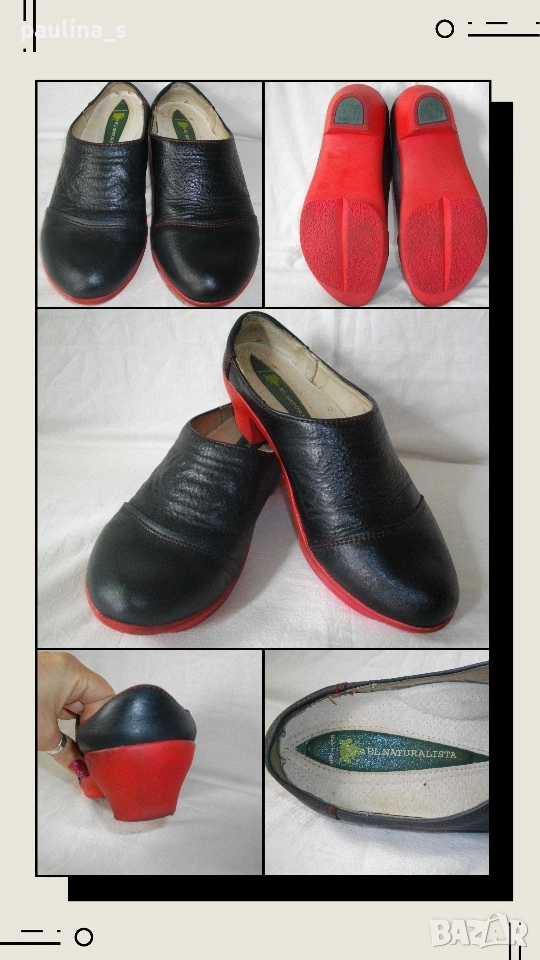 El Naturalista"! Цената е крайна, без пазарлъци 65 евро. Дамско ортопедично сабо / Обувки, с висока пета и червена подметка от еластичен силиконов гьон / латекс. Обувките са изцяло изработени от естествени материали - здрав телешки бокс, фин велур за стелката, и хипер еластичен червен гьон. Стелката е със супинаторна подложка, подложка за спаднал напречен свод. Маркиращите украсителни тегели са съща в червено. Подходящи са за всички аномалии в опорно-двигателния апарат(вклюая и гръбначния стълб дискови хернии, гръбначни деформитети)-плоскостъпие, халукс валгус, артрити, подагра, дисторзии, пост-фрактури и др. Освен лечебни са и много красиви и впечатляващи, особено червената подметка, удобни са и могат да се носят и от здрави дами. Това 1/2 от реалната цена, обувани са 2-3 пъти, идеално запазени без забележки, снимките са реални! Стелка 26см / платформа 2см / токче 5см
