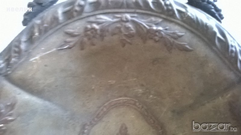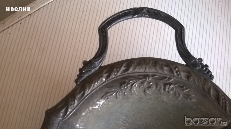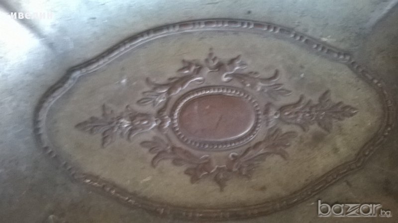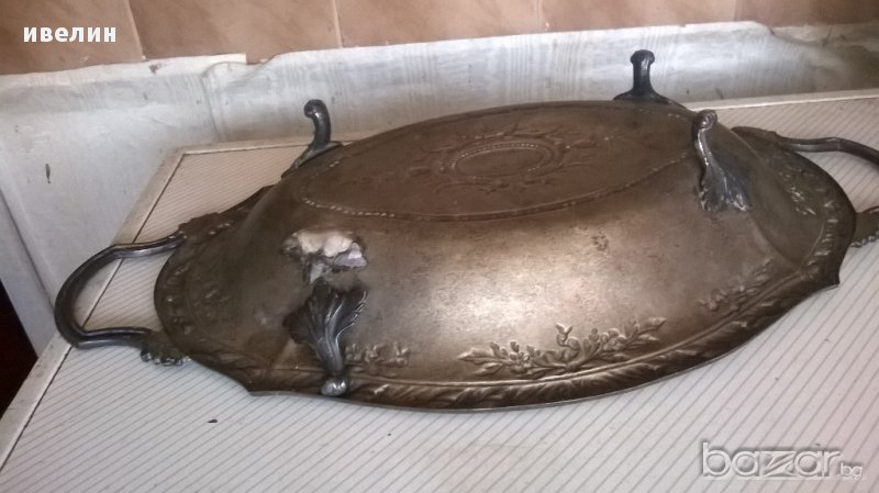 стара посребрена антикварна купа-арт деко.материал-бронз.висока е 7см,дължина с дръжките 44см,без дръжките 35см,широка 25см.едното краче трябва да се запои.