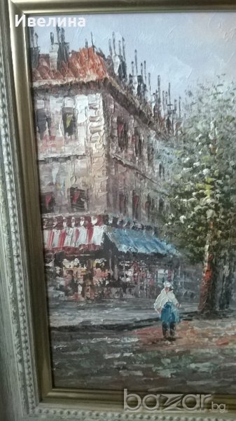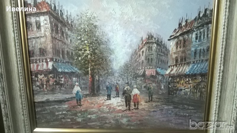картина-градски пейзаж.стил-импресия,масло на платно с подрамка.подписана,масивна дървена рамка с размери 59см/67см,вътрешни 40см/50см.