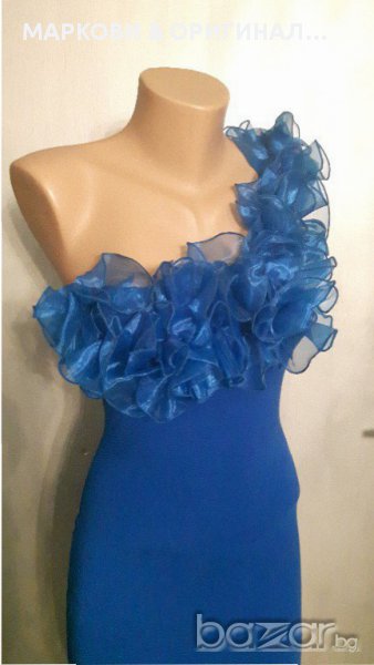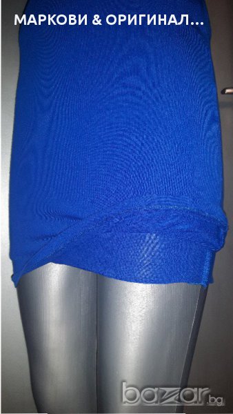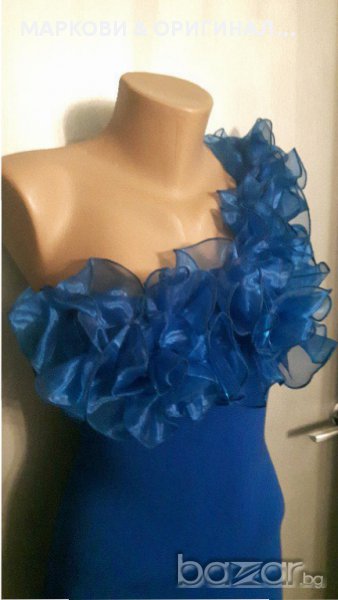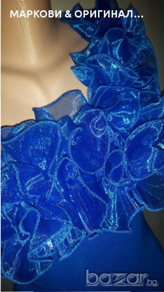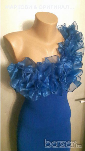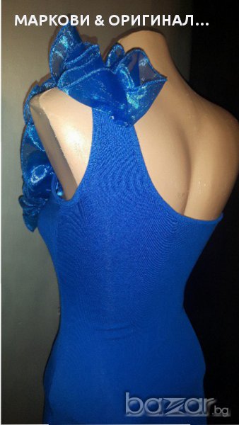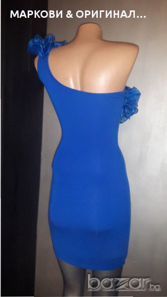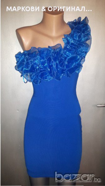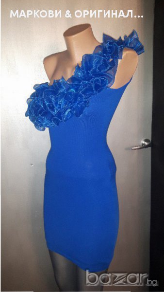 Прекрасна,маркова рокличка,подходяща за официални поводи в наситен турско син цвят и красиви къдри.Не прозира,има подплата и не е много къса(манекена е висок) Няма забележки и никакви завалвания. Подходяща за дами с размер S XS , разтеглива материя.