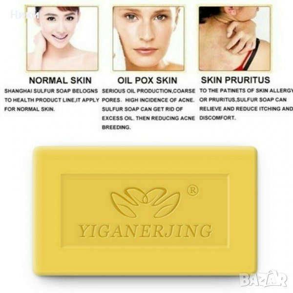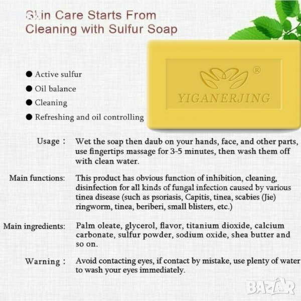 YIGANERJING серен сапун е уникално формулиран за проблеми на кожата, като псориазис, пърход, акне, екзема, себорея, херпес, кожни гъби. Той е обогатен с минерали от Мъртво море и сяра. Съдържа зехтин и алое вера, които балансират естествената влага на кожата. Приема нова формула за дезинфекция на сярата, която е ефективна при ограничаване на прекомерната секреторна мазнина и елиминиране на бактериите. Помага за акне, прониква в порите, за да контролира акне дефекти и помага да се запази кожата ясно от нови акне пъпки. Той спира сърбежа и поддържа кожата ви свежа и здрава