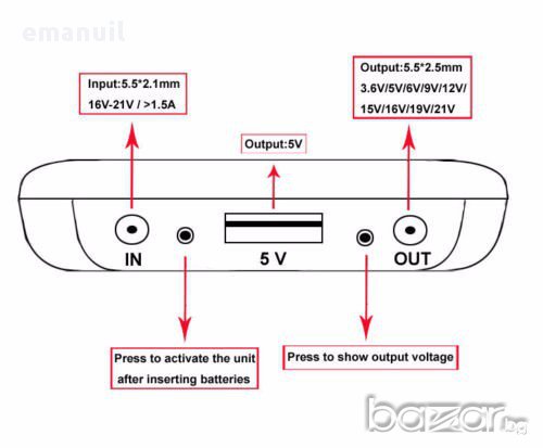 DC output: 3.6V 5V 6V 9V 12V 15V 16V 19V 21V 3.3A(max) с ограничител по ток и температурна защита