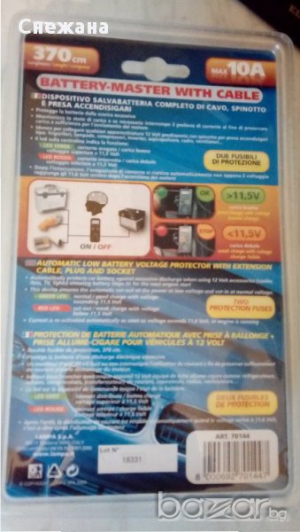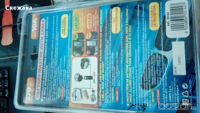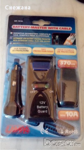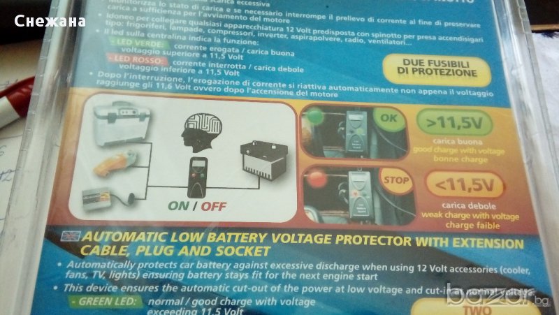 Предпазва батерията от прекомерно изпускане, следи състоянието на заряд и, ако е необходимо спира текущата вземане на проби, за да се съхрани достатъчно живот на батерията до, стартиране на двигателя .Може да свържете всеки уред на 12 волта оборудване, приготвена с куплунг за запалката.Може да включите хладилници, инверторни компресори,вентилатори, радио касетофони и други.