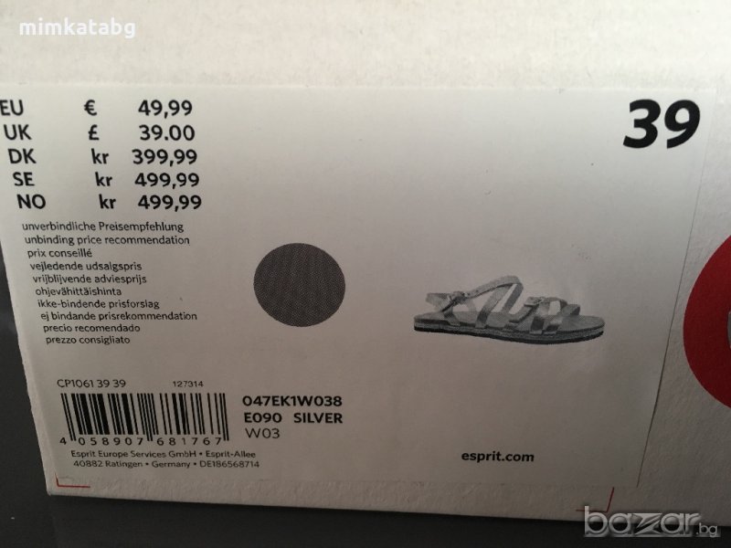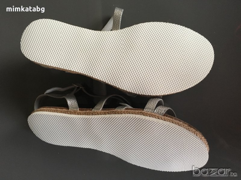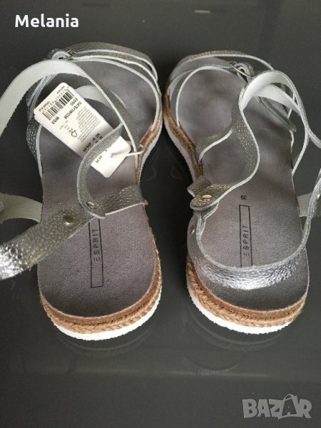 5. Сребърни сандали Esprit - много модерни, красиви и удобни. С ергономична подметка. Подходящи и за по-широк крак. С каишки. Естествена кожа. Номер 39. Размер на стелката - 25 см. В отлично състояние. Цена - 50 лв.