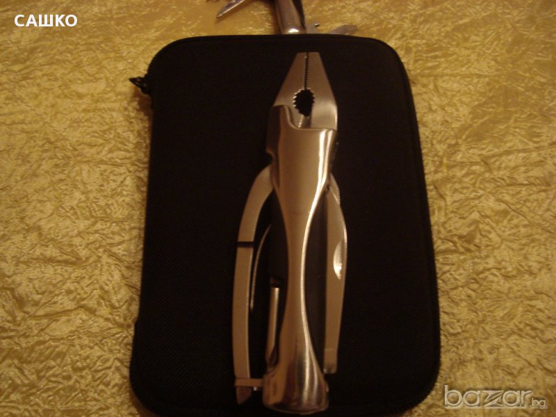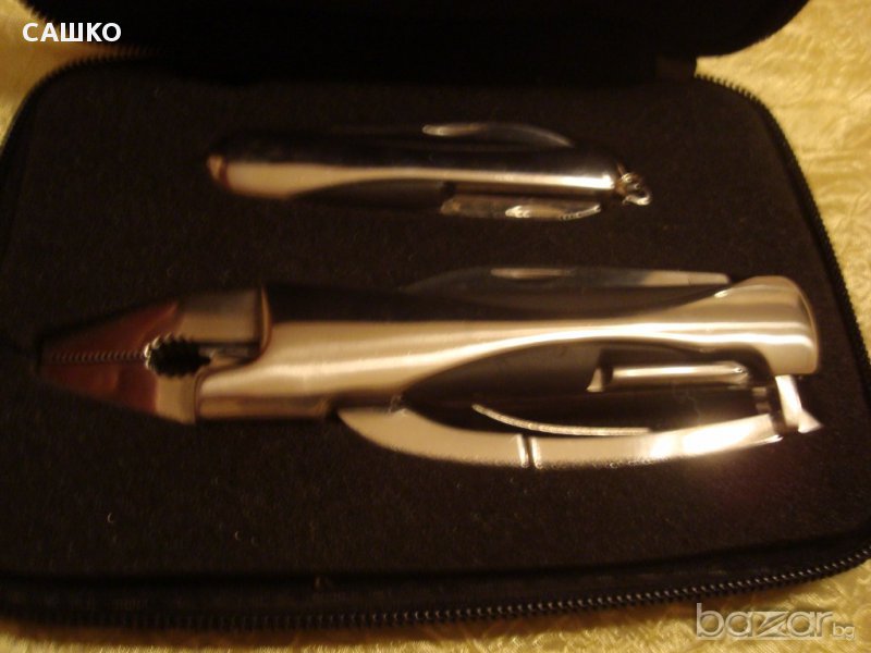 Мултифункционален комплект инструменти-луксозен. Два отделни инстументи- ножка и клещи с различни приставки, никелирани поставени в специална луксозна кутия.Подходяща за подарък. Закупен от Германия.