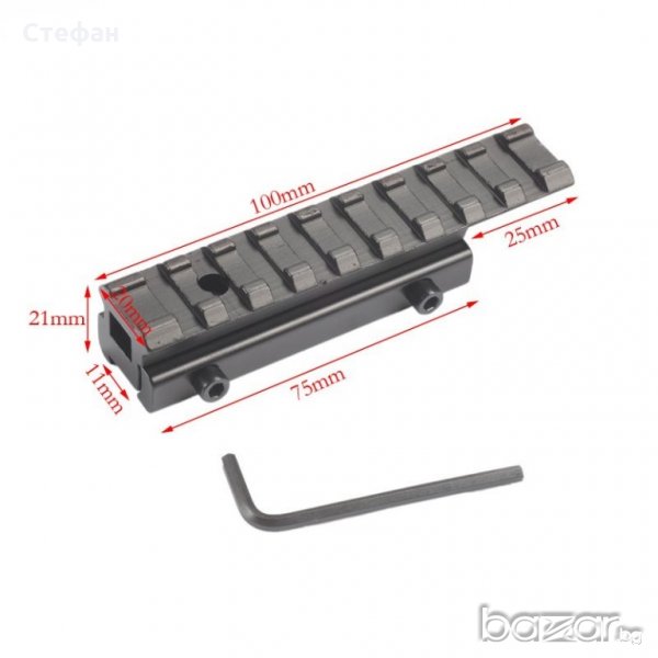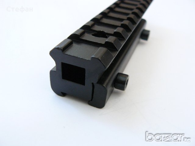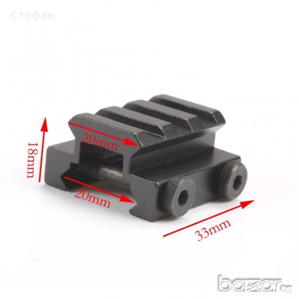 Уивър базата - 44мм, височината от Уивъра до началото на ринга е 15мм., диаметър на ринга 30мм, като в комплекта има пластмасови адаптери за оптики на 1’’ (25,4мм)/първите две снимки/ Цена 25лв/12,78eur/бр.