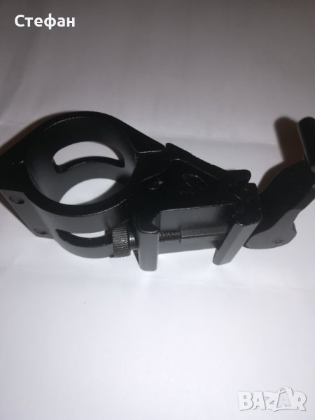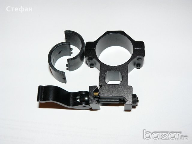 Модел 2. Монтаж за фенер на Уивър захващане, тип бърз. Наличен в диаметър на ринга 25,4мм и 30мм. Ширината на монтажа е 30мм, изработен от алуминий. Позволява странично изнасяне на фенера /трета и четвърта снимка/, но с определен диаметър на фенера. Цена 25лв/12,78eur/бр. - Бърз монтаж за фенер със странично изнасяне на 1" с Уивър захващане /последните три снимки/ - 28лв/14,32eur/бр.