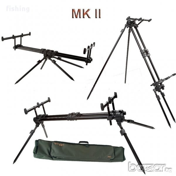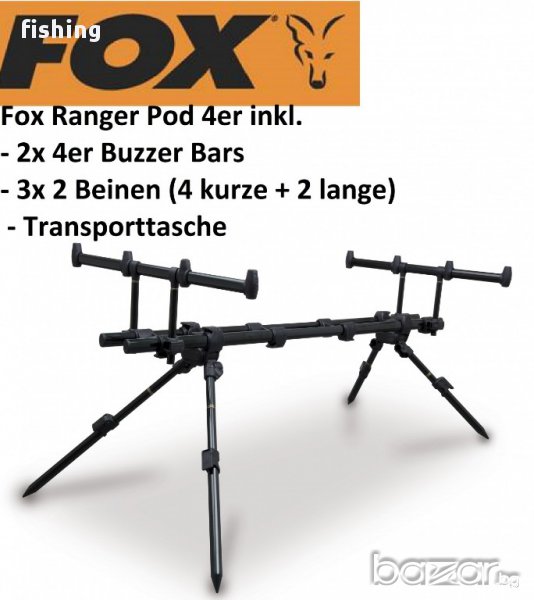 Шаранска стойка Fox Ranger MK2 Rod Pod 4. Тя е проектирана за четири шарански пръти и е изключително стабилна, благодарение на дизайна с четири крака. Крачетата се регулират по височина (също зумер барове), така че тя може да бъде хубаво разпъната и регулирана за всякакъв терен. Също така краката може да се заключят под 6 различни ъгли и така да регулирате допълнително височината и наклона на стойката. Възможност за предвижване на краката в средата или в двата края, чрез използването на специално доставени подложки. Перфектна за всякакви терени!