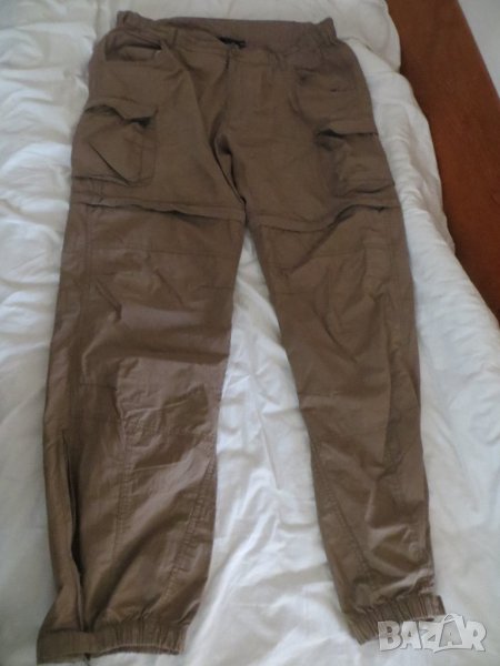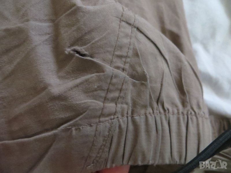 Има нарушавания на плата в долната част на крачола и дупка малко над края на крачола видимо от снимките. Ципове, които позволяват панталоните да се носят като къси.