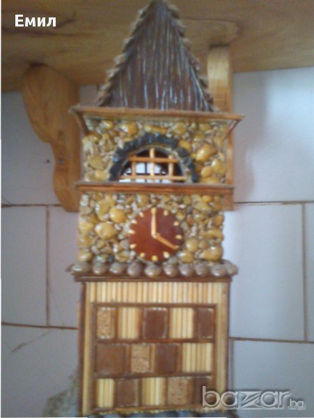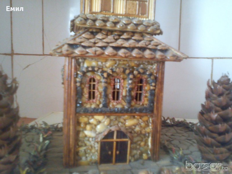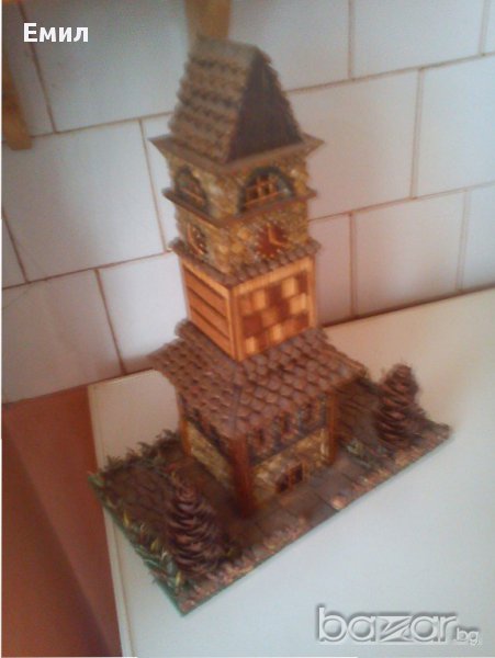 1. Часовникова кула ,ръчна изработка от камъчета ,борови шишарки за покрива и др. Размери -височина 38 см.,дължина -30см. широчина 18 см.
