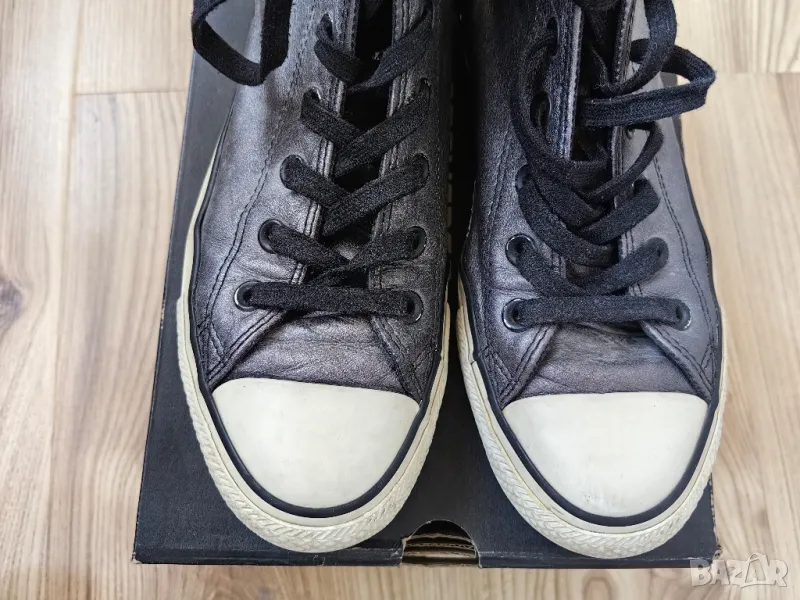 Дамски кецове CONVERSE оригинал и, номер 39 (24.5см). Горната част е от сребриста, тъмно сива естествена кожа, много запазени. Произведени във Виетнам. С оригиналната кутия.