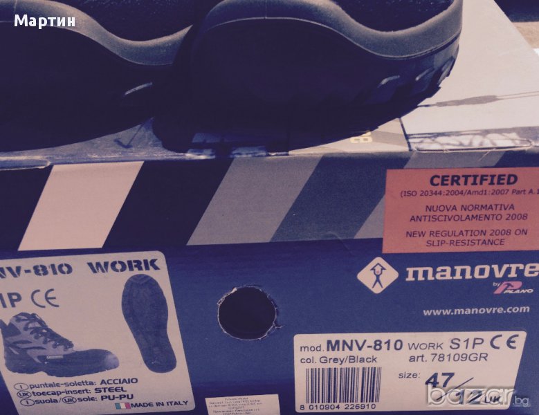 Италиански работни обувки MNV, модел 810 S1P, № 47, Стелка 31см, Нови с кутия, материал: текстил, велур, Цвят: сив. Обувките имат покритие от Тефлон, дишаща подплата, защитно бомбе и устойчива подметка. Цена 69 лв.