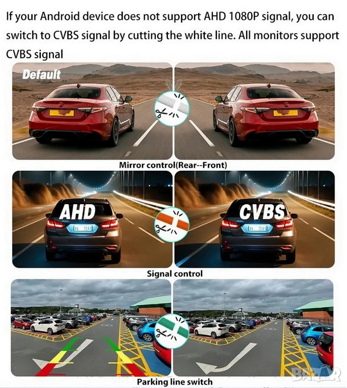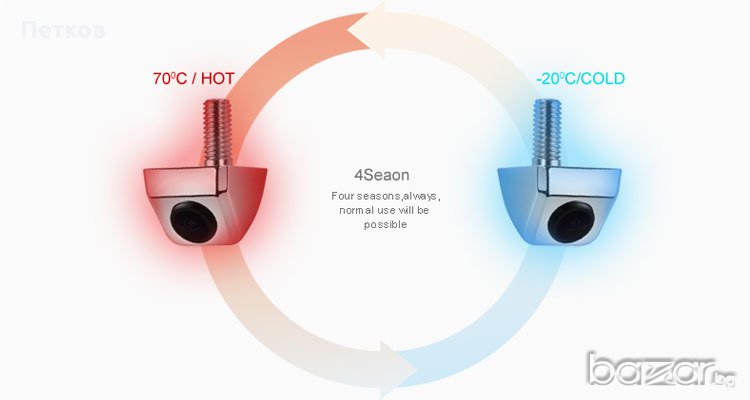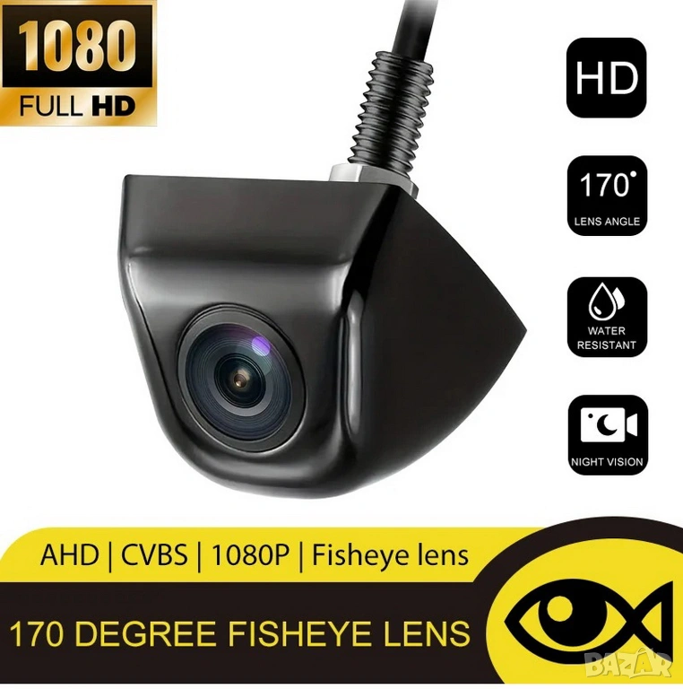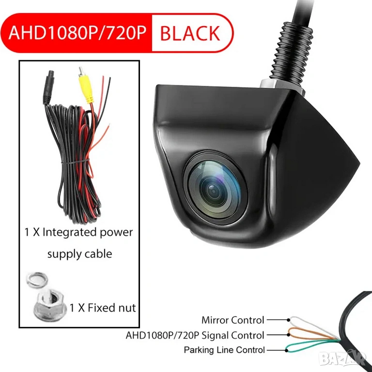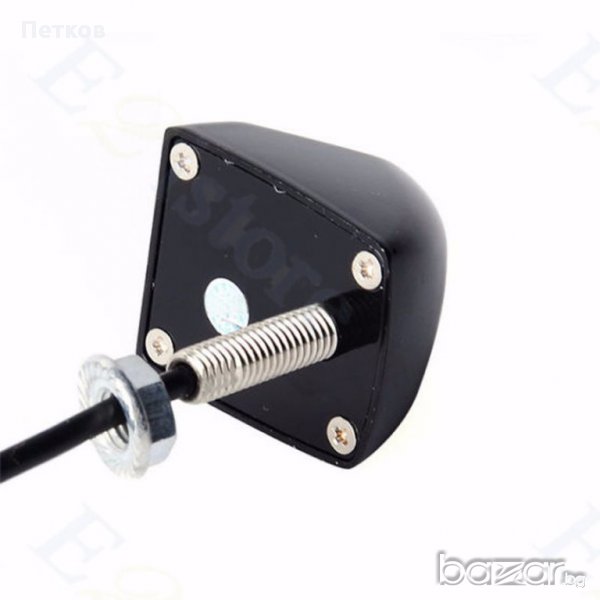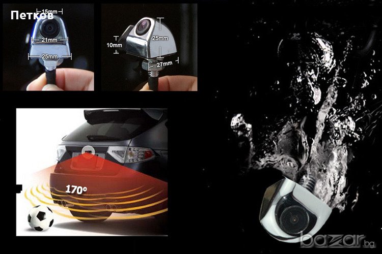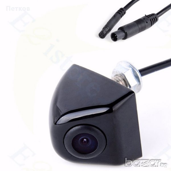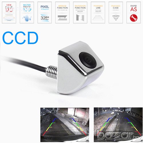 Нова водоустойчева метална мини камера за задно виждане за автомобили – с универсално закрепване. Закрепващата шпилка остава под камерата и гайката остава вътре в автомобила, без да се виждат външни глави на болтовете против кражба. Подходящо за всички видове автомобили. Със CCD HD сензор. С високо HD качество на изображение, голяма резолюция, висока чувствителност на тъмно, висок клас влагоустойчивост и спомагателни линии за паркиране, които не могат да се премахнат. С извод за автоматично превключване на монитора и камерата при включване на скоростния лост на задна скорост. Размери в основата на камерата: 28х33мм.Височина: 25мм. Водоустойчива.