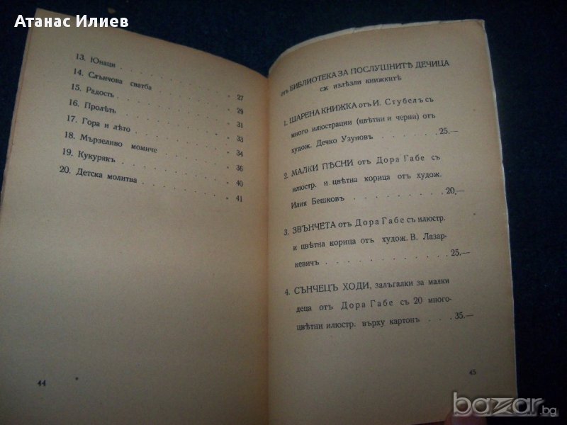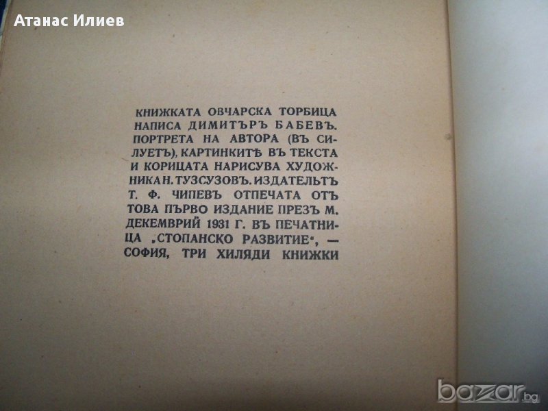 Стара детска книжка със стихове "Овчарска торбица" от Димитър Бабев. Книжката е с меки корици в много добро състояние, страниците не са разрязвани. Книжката е с илюстрации от худ. Никола Тузсузов. Книжката е 48 стр. издание 1932г на издателство Т. Ф. Чипев. Издадена в поредицата "Книжки за послушните дечица" №9.