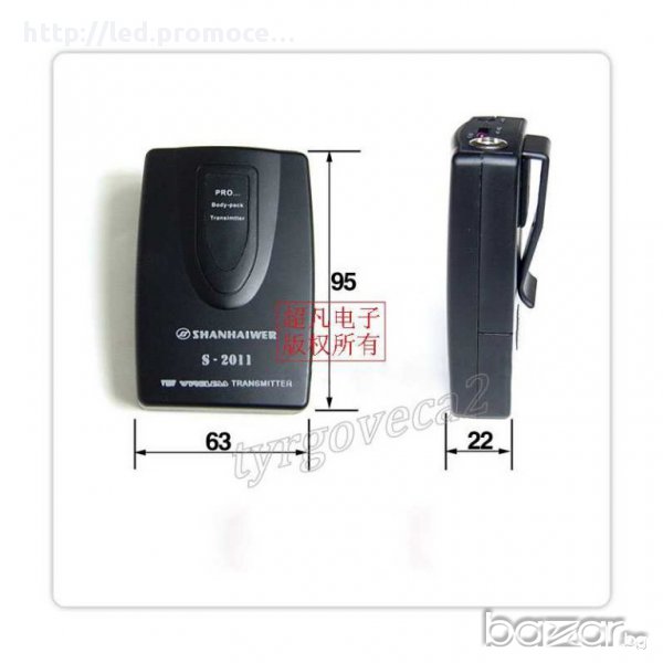 Технически Характеристики : SHANHAIWER S-2011 Система VHF Pocket Wireless MicrophoneМодел: S-2011 Приемник Размер: 94мм х 18,5 мм х 22,5 мм Предавател Размер: 94,5 мм х 63,5 мм х 22,5 мм - VHF210-266 честота (Quartz колебание верига / Crystal осцилатор)- 100% индивидуална честота - Surface technologu с висока надеждност (SMT) продукт - Приемник, използвайки само 1.5V батерии, вграден интегриран високоефективното повишаващ схема, приемник и трансмисия - Вградена компресия - разширяване на веригата, елиминира напълно фоновия шум и микрофона на емисиите и изключване на въздействието на звук - Изграден с копчето старта на настройка на чувствителността, която може да промени чувствителността на пикап - Работно разстояние до 50 метра (открита площ) - Подходящи да подкрепят използването на други аудио усилвател схема, също може да бъде голяма (6.35мм) се превърне малък (3.5мм) адаптер - Включете жака за микрофон на компютъра се използва, за да си чати свободно- висока стабилност и висока надеждност компоненти за повърхностен монтаж, повърхността на заявление за монтиране на технологиите и производствения процес, и да прилага процеса на sreening на стареене, откриване и отстраняване на ранното отпадане от компоненти, в сравнение с нормалните пинови компоненти, signifcantly подобри стабилността на продукт, надеждност и експлоатационен живот.