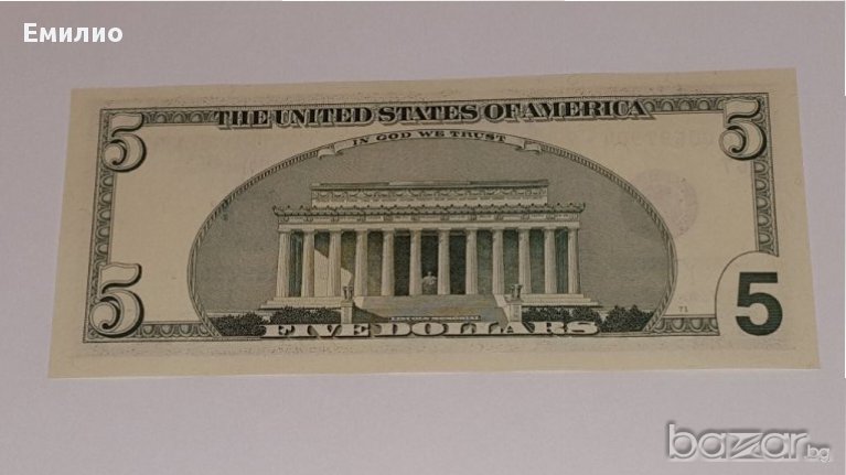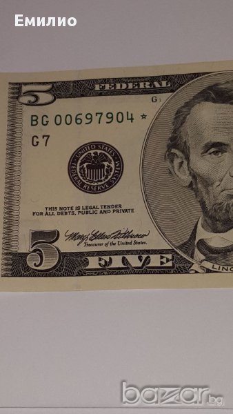 Продавам РЯДКО СРЕЩАНА БАНКНОТА $ 5 Долара с ЗВЕЗДА СЛЕД СЕРИЙНИЯ НОМЕР И САМО 6 ЦИФРИ!НЕЦИРКУЛИРАЛА. Федерален Резерв ЧИКАГО - G от 1999 год.Цена € 44 евро. ВАЖНО!!! НЕ ПРАЩАМ С НАЛОЖЕН ПЛАТЕЖ. СОФИЯ МОЖЕ И ЛИЧНО ПРЕДАВАНЕ, ЗА ОСТАНАЛИТЕ НАСЕЛЕНИ МЕСТА ПРЕДВАРИТЕЛНО ПЛАЩАНЕ ПО БАНКОВ ПЪТ ИЛИ ИЗИПЕЙ.