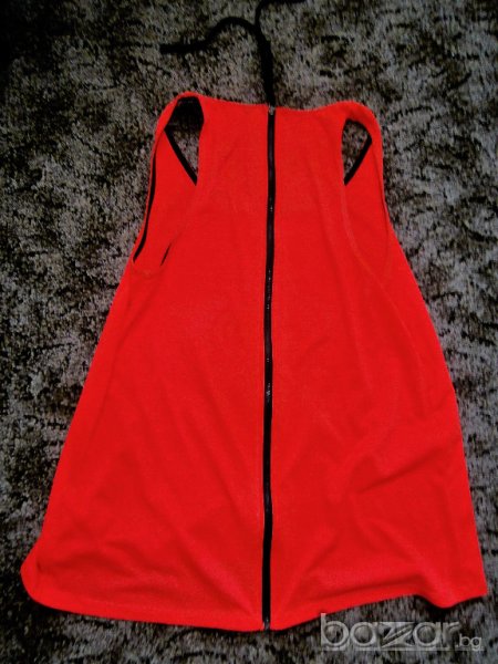 Дамски потник с интересна щампа отпред. Закопчаването му отзад е с цип, т.е. може да регулирате отзад колко да е отворен ципа. Пада сводобно по тялото. Подходящо е за дънки. Потничето е носено, но е запазено и е в отлично състояние.